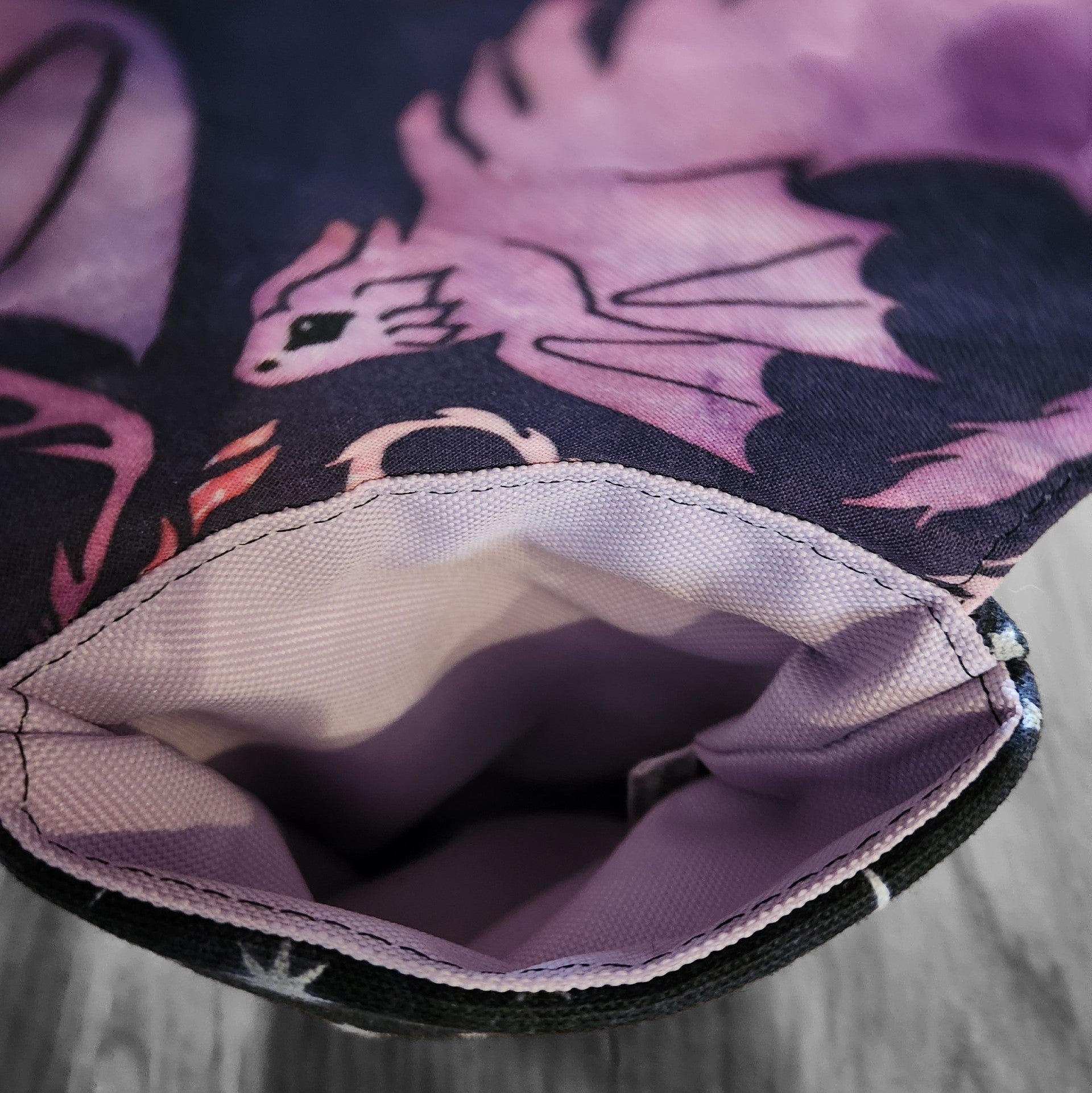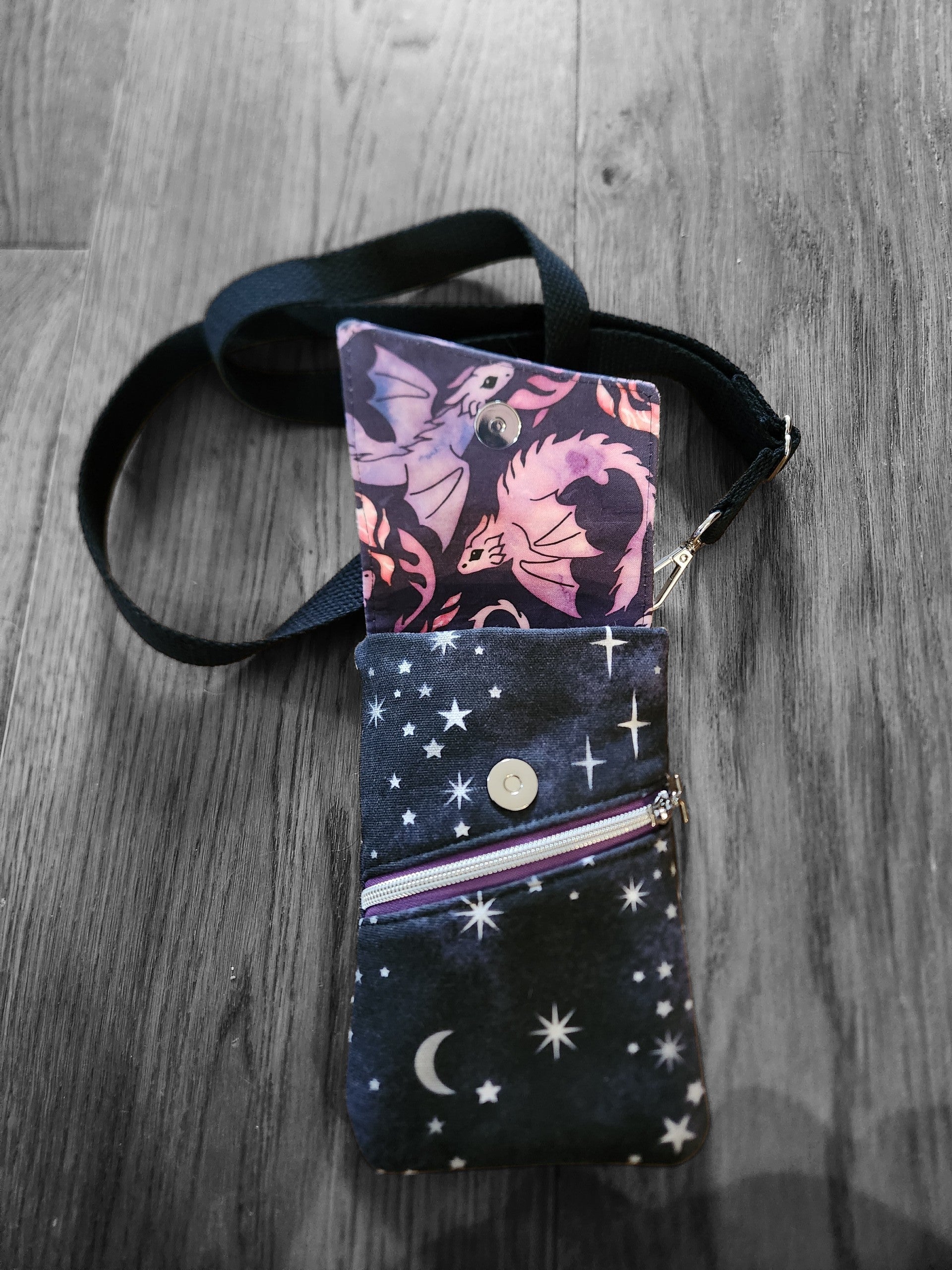 This slim phone pouch was created for the dragon dreamers and night sky wanderers. The flap features a gathering of soft pink dragons against a twilight sky, while the body of the pouch is scattered with stars and a quiet crescent moon. Together they feel like a small piece of a fantasy world you can carry with you wherever the day leads.
