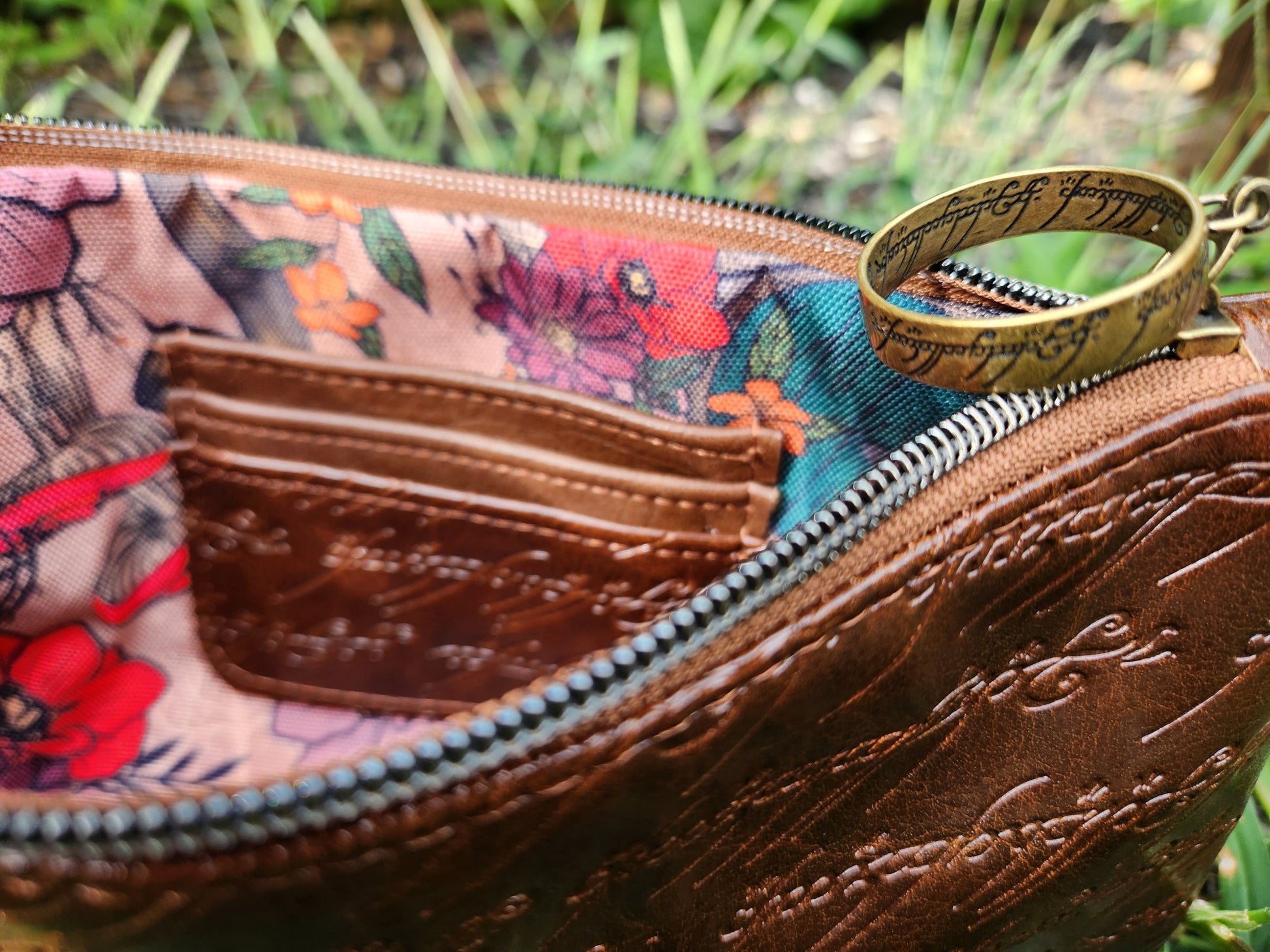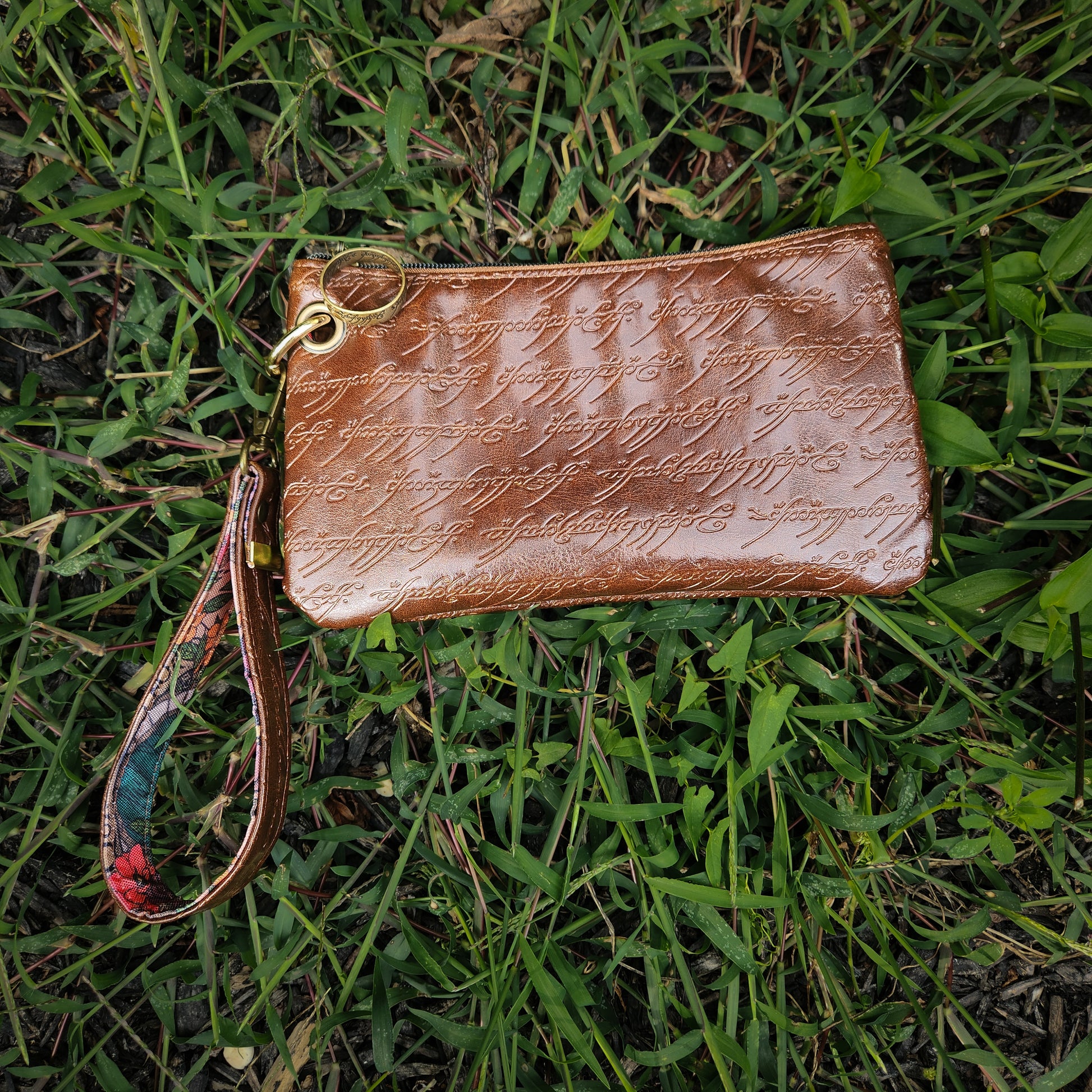 This enchanted wristlet shimmers with embossed golden script, reminiscent of the ancient elvish writing found on the One Ring itself. Paired with a floral lining that whispers of faraway gardens in Middle-earth, it’s the perfect balance of fantasy and function. Slip it on your wrist and carry your cards, cash, and trinkets as you set out on your own journey — whether to the market or into the wild.