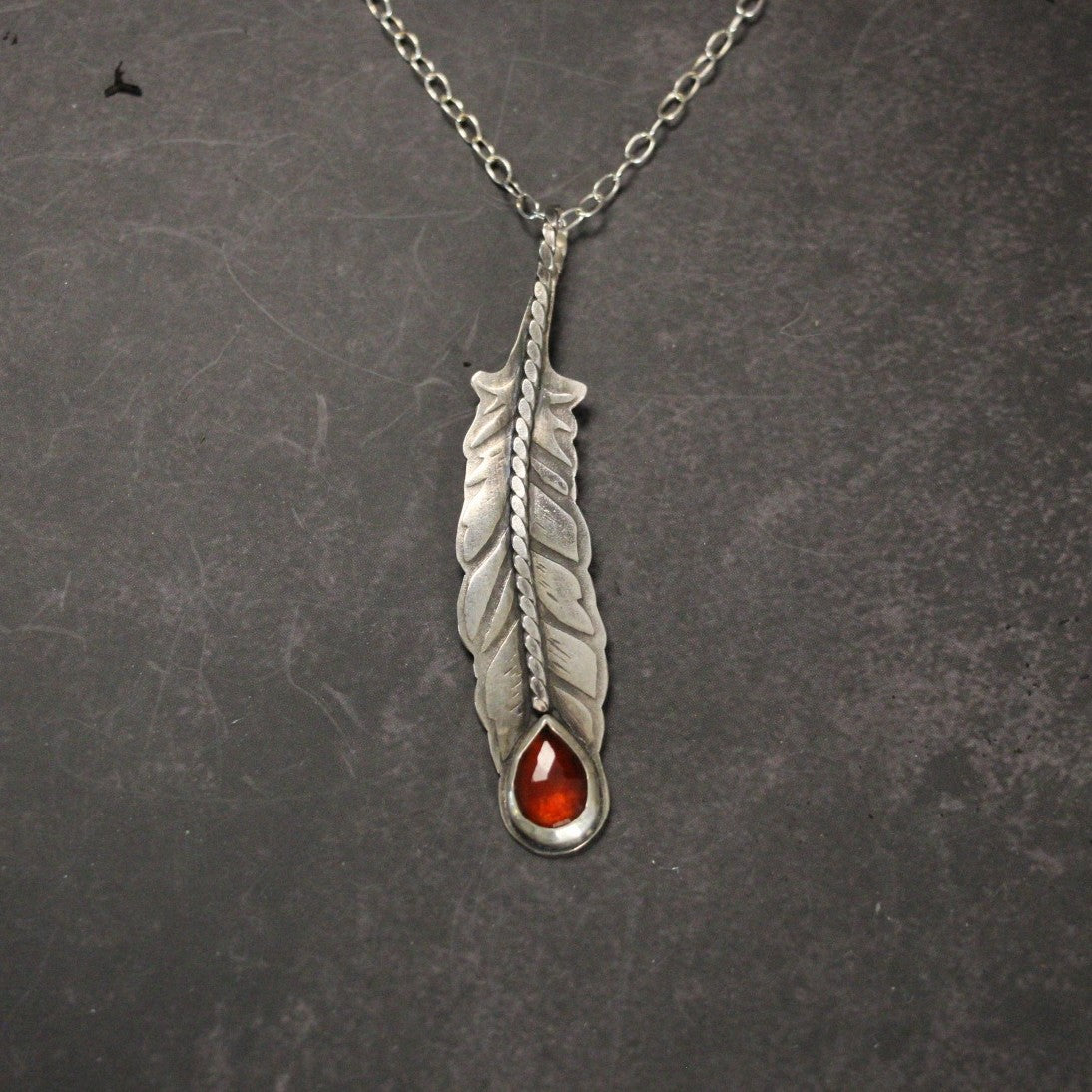 The feather has long been tied to flight, omens, and unseen forces that guide the path forward. Handcrafted in sterling silver, its textured surface catches light like a wing in motion. At its center, a deep garnet glows like a banked ember, a stone long associated with vitality, strength, and the fire that sustains endurance.