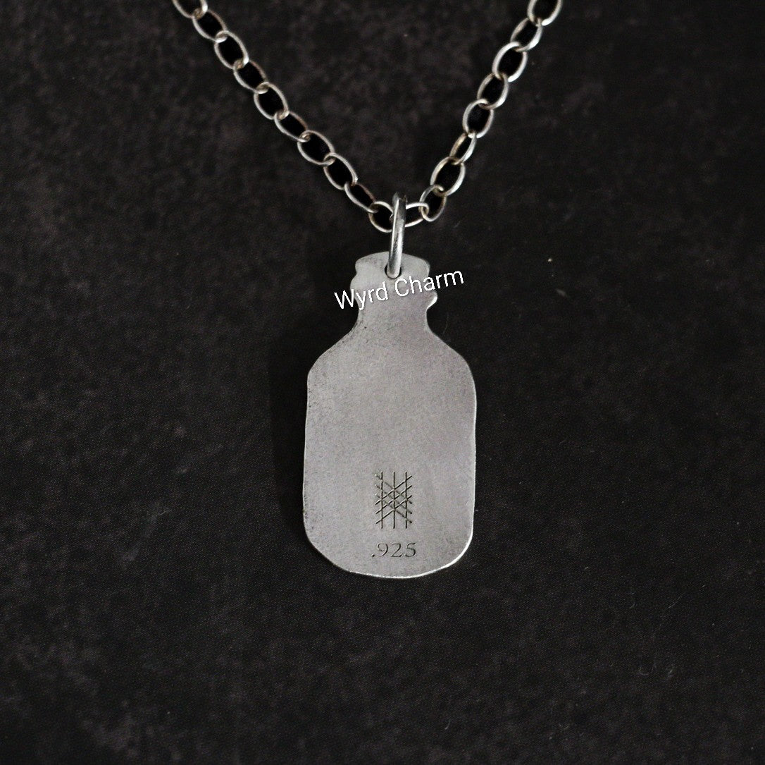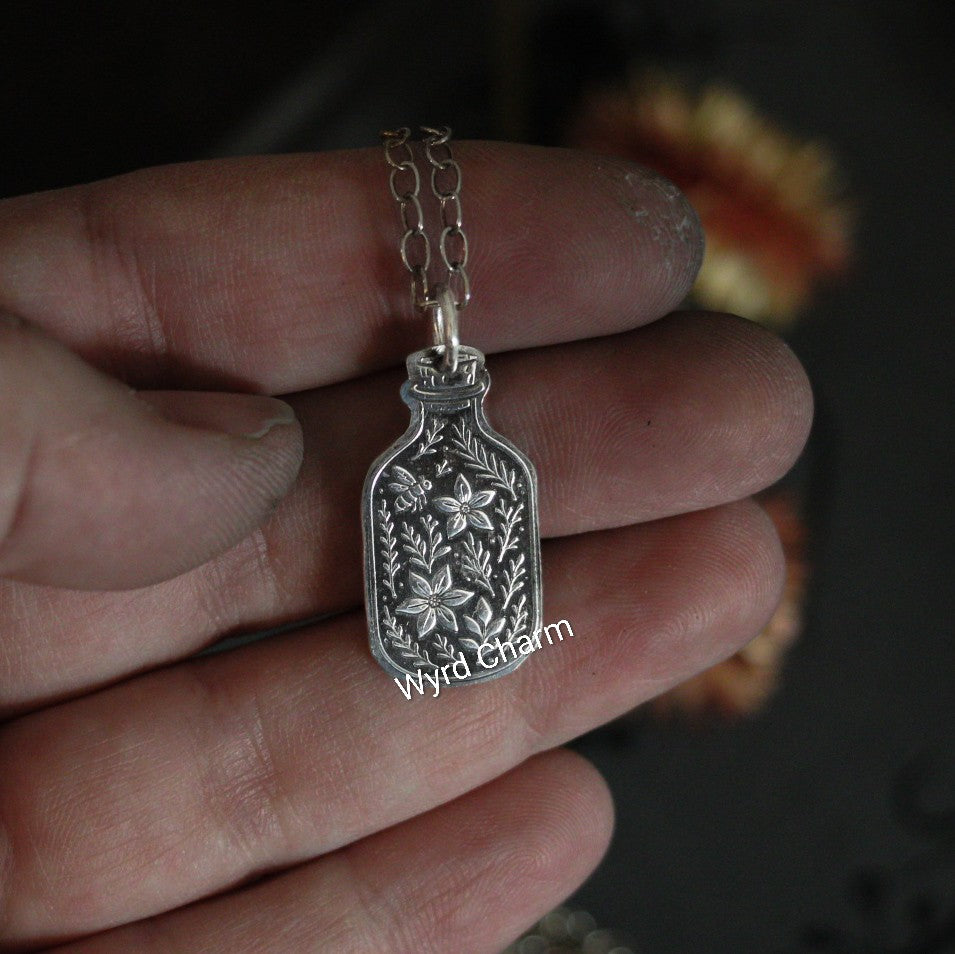 Spring Bloom is a sterling silver potion pendant inspired by green witchcraft, early spring growth, and the quiet magic of cultivated herbs. Etched with botanical details, it carries the feeling of gathered leaves, garden paths, and intention set through care rather than force.