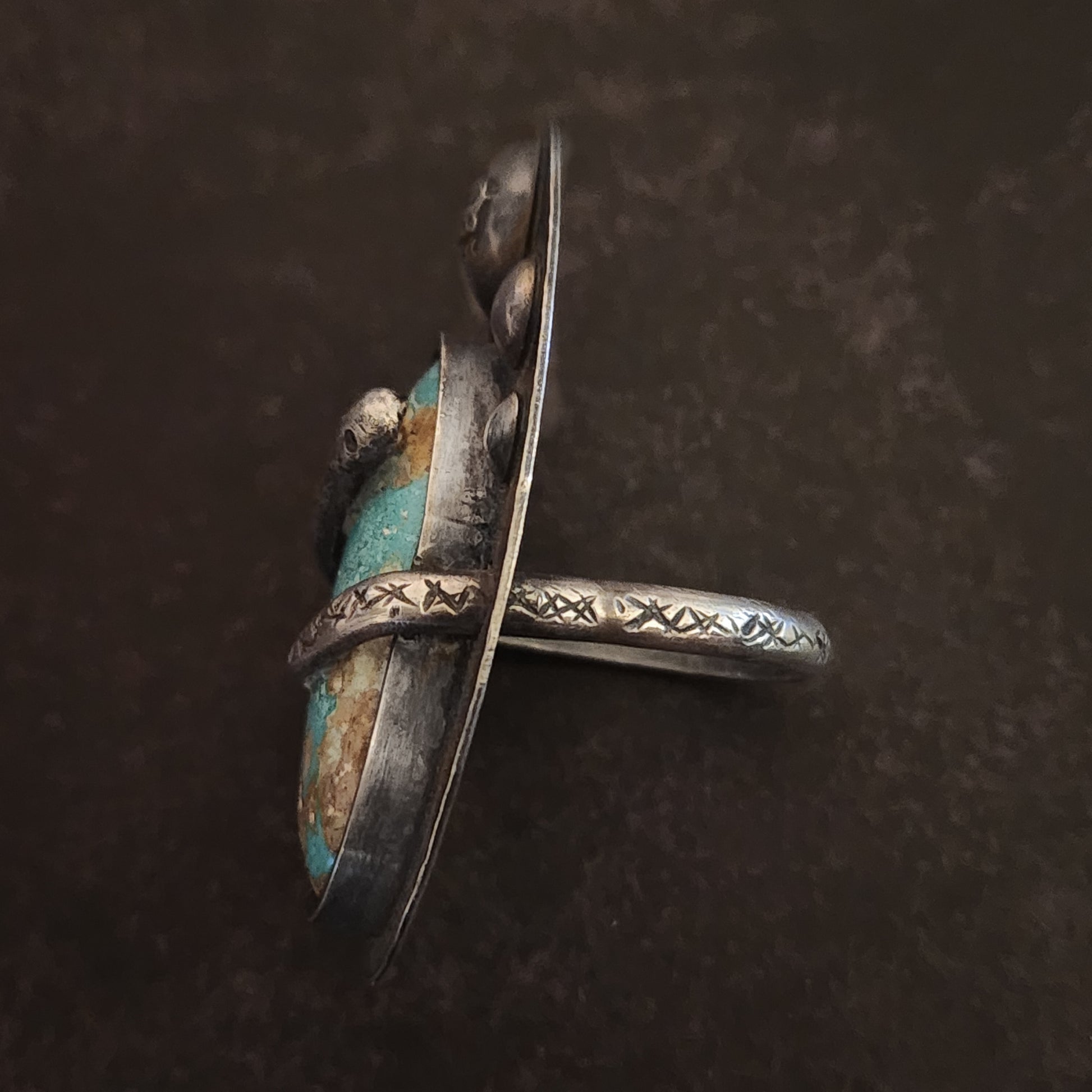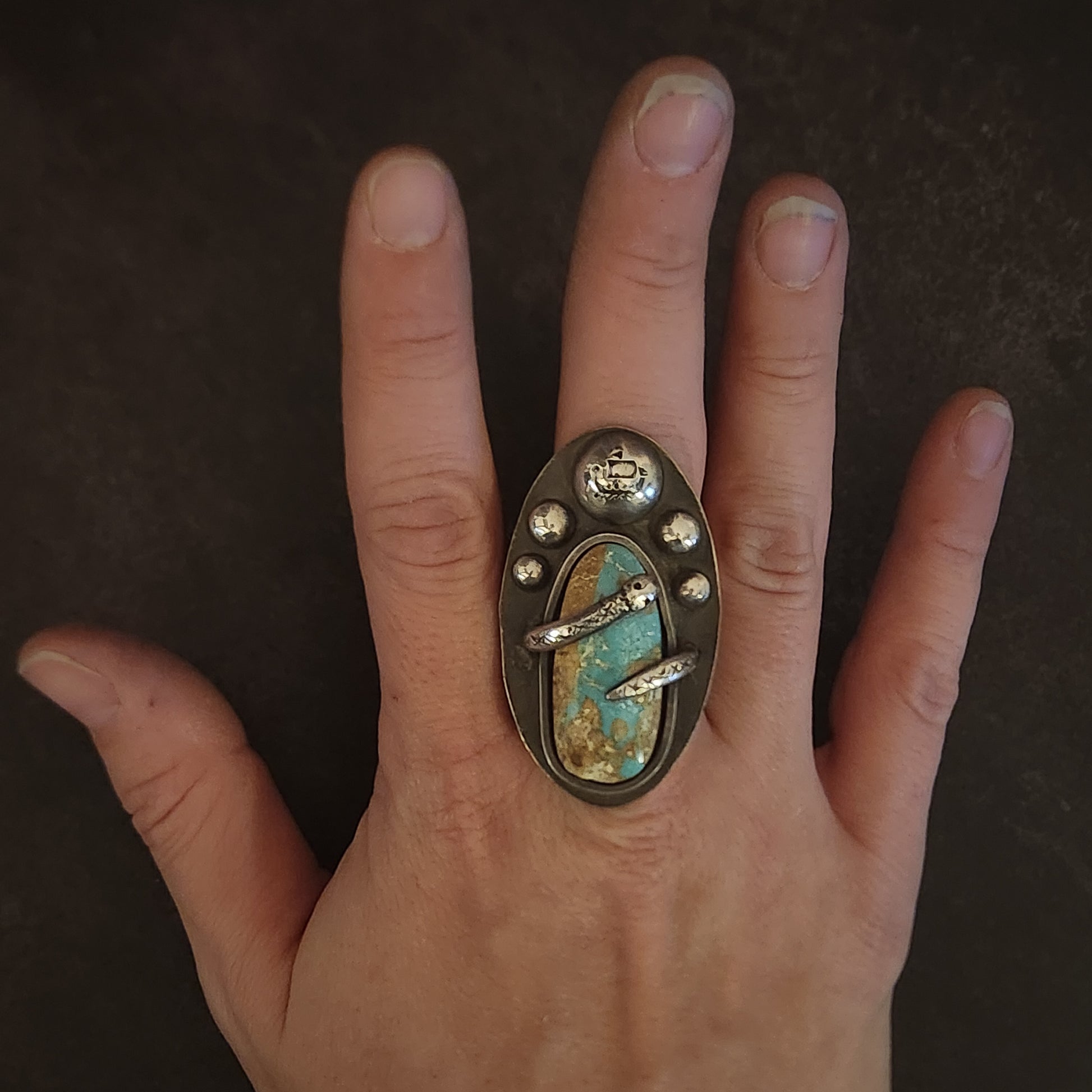 A Viking ship rides the turbulent waves at the surface while the great serpent coils around the band, his body forming the ring itself. Beneath the stone, engraved ocean currents echo the movement of the world serpent below, unseen yet ever present. At the center rests a striking Blue Ribbon Turquoise, evoking sea, sky, and storm.
