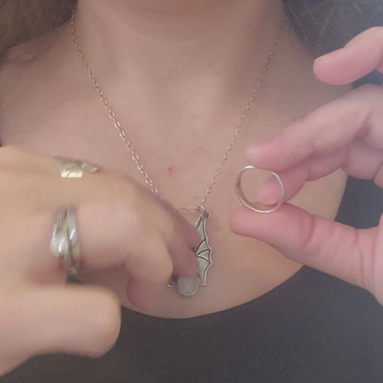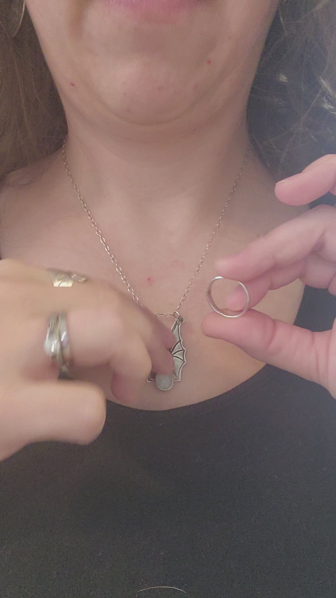 This one of a kind ring keeper necklace is forged in sterling silver and set with a luminous rainbow moonstone, its wings outstretched in silent protection. Designed to hold a ring securely while worn, it allows you to slide a ring onto the center loop and keep it close to your heart when it’s not on your finger. Whether you’re safeguarding a wedding band, a ritual ring, or a personal talisman, your treasure rests in dragon’s care.
