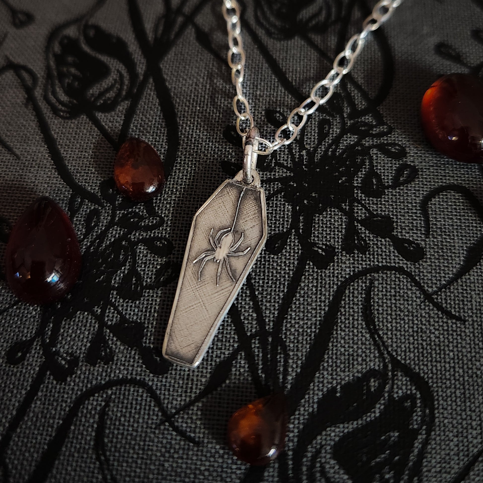 This sterling silver spider coffin necklace is a quiet tribute to the mysteries of the night, featuring a carefully etched spider standing guard like a secret waiting to be discovered. Made for bookish souls who love shadowed stories and midnight moods, it’s a small talisman you can wear close when you want your jewelry to feel like a chapter of its own.