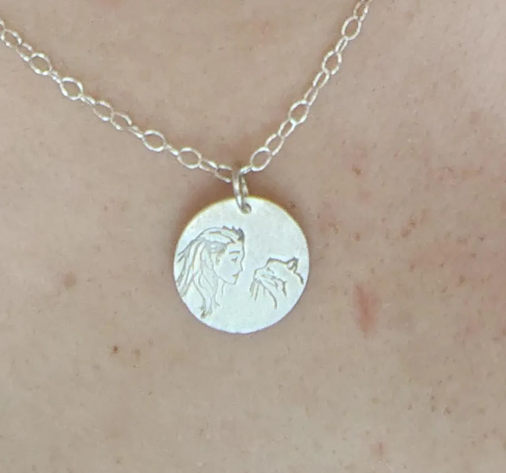 For several months I've been wanting a new pendant, something that embodies feminine strength and a love of cats. Freyja + Norwegian Forest Cat. I'm getting used to wearing the necklace, I have spent a week waiting for it to come so I can put it on. I did have an assumption that the design would be a bit darker (black), but it's still noticeable.